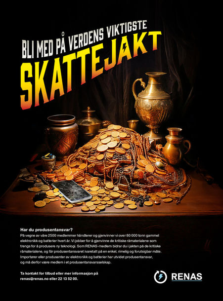 Den nye filmen for RENAS handler om mye av det samme som flere av verdens konflikter, jakten på kritiske råmaterialer som er avgjørende for moderne teknologi. De finnes blant annet i Kina, Ukraina, Kongo og på Grønland – men også i kjøkkenskuffen hjemme hos folk flest. Vi håper flere gjør som folka i denne filmen – bruker en time eller to til å arrangere verdens viktigste skattejakt hjemme. Filmen gikk på reklamefrie dager på TV2. Vi laget i tillegg annonser til fagpresse som henvendte seg direkte til bedrifter med produsentansvar.